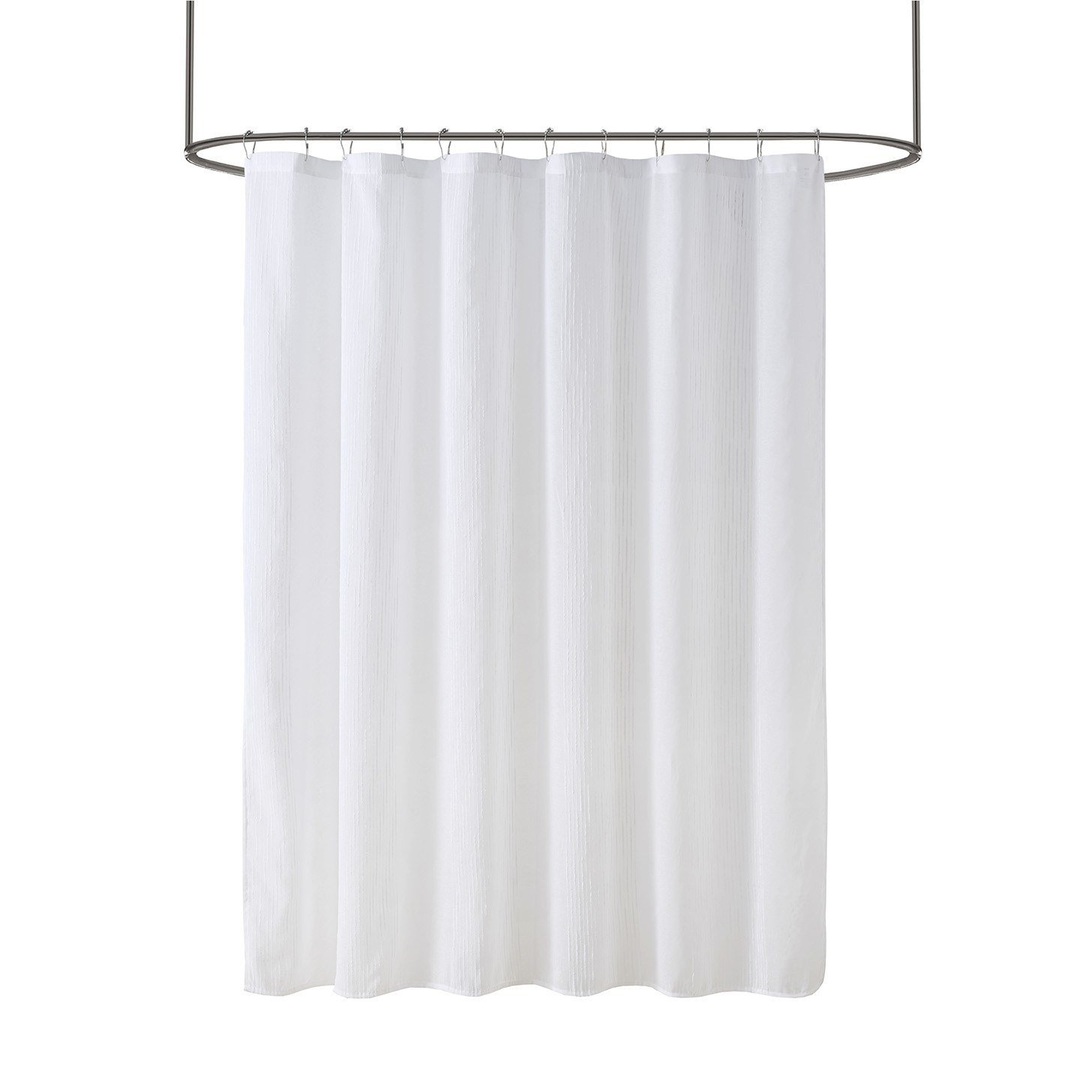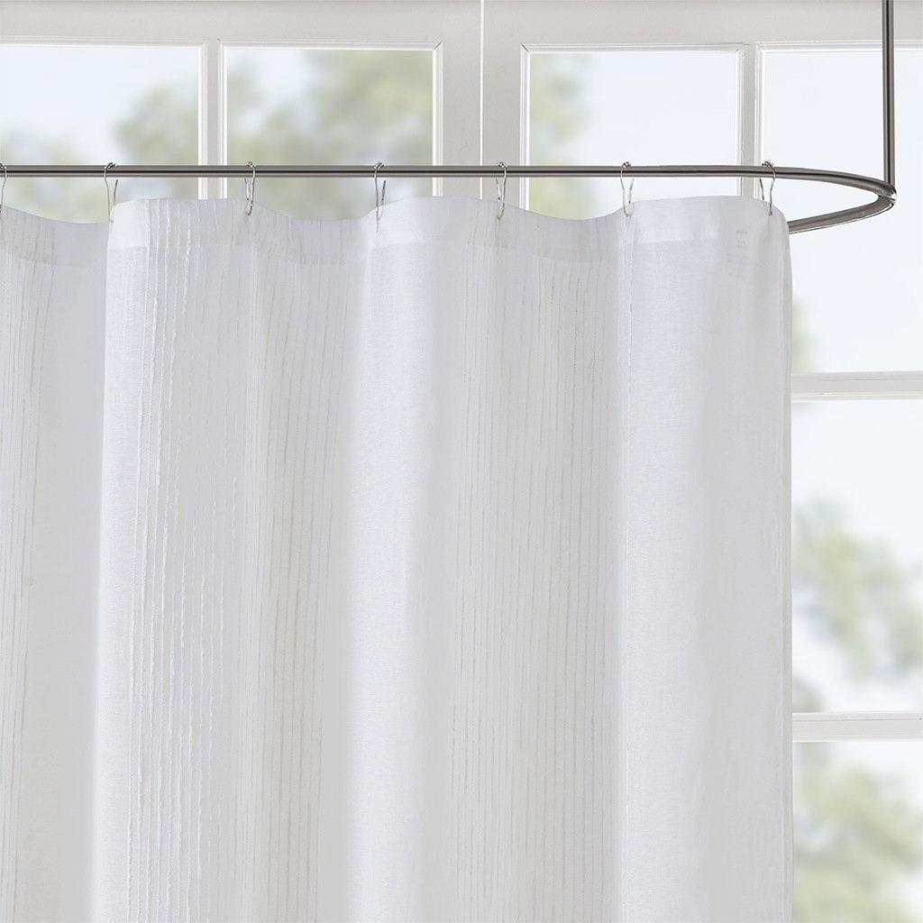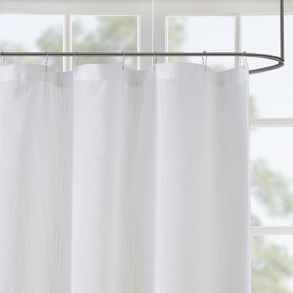 DescriptionAdd a casual update to your bathroom with our Madison Park Anna sheer shower curtain. A striped texture within this shower curtain provides the perfect backdrop for the soft white hue, creating beautiful dimension for a clean and fresh update. As this curtain is sheer, you may want to use an opaque liner to give a more solid look.Product Details72x72"1 Shower Curtain:72"W x 72"LMaterial100% polyester