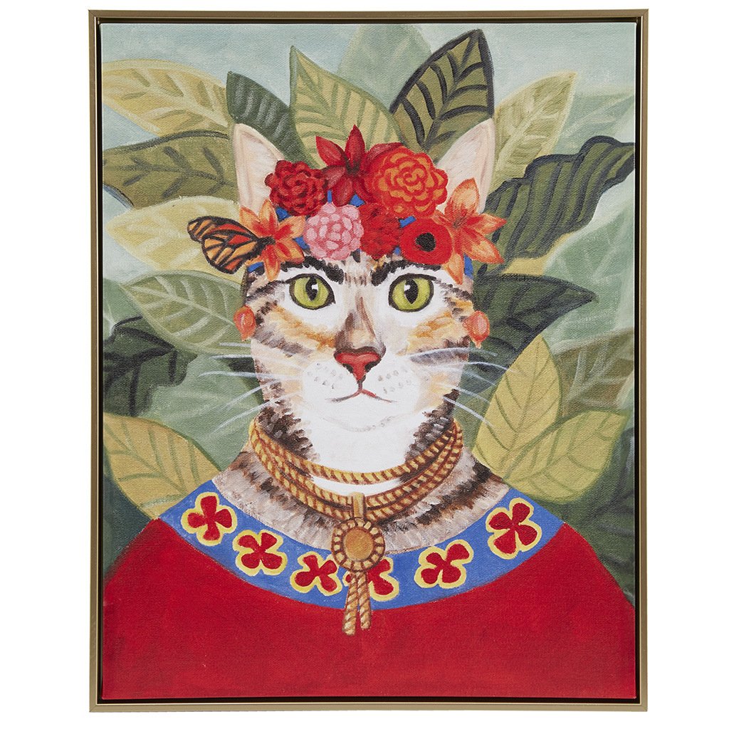 DescriptionEnliven your decor with this 16.5"W x 20.5"H Bohemian-Style Cat Portrait Wall Art by Carol Lew. This vibrant piece features a whimsical cat sporting a colorful floral headdress, poised amidst a forest backdrop. The artwork comes in an embossed, golden-colored frame that adds elegance. Easy to install with pre-installed D-ring hangers. Let this playful feline masterpiece captivate and charm your guests. Add a touch of artistic allure to your bedroom, living room, or study room home decor.Product DetailsSee belowOverall:16.5"W x 20.5"H x 1.25"DCanvas Size:15.75"W x 19.75"HMaterialWood: 45%Polystyrene: 35%Canvas: 10%Paper: 10%