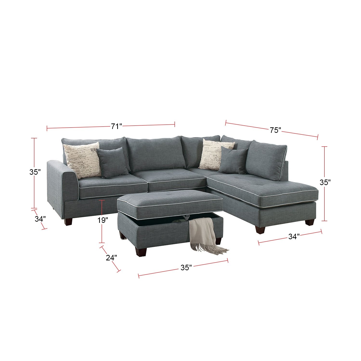 Reversible Chaise: 34" x 75" x 35"H; Sofa: 71" x 34" x 35"H