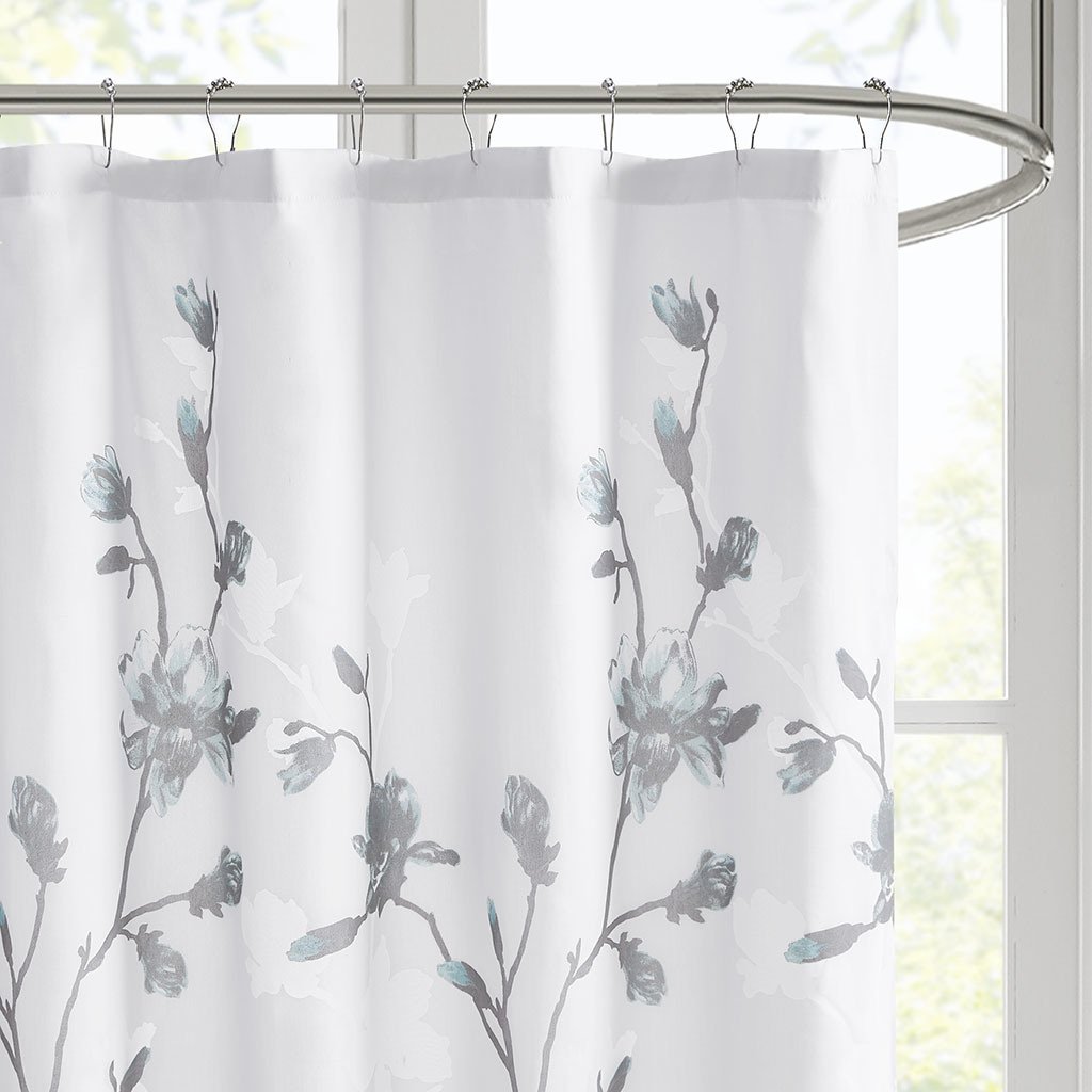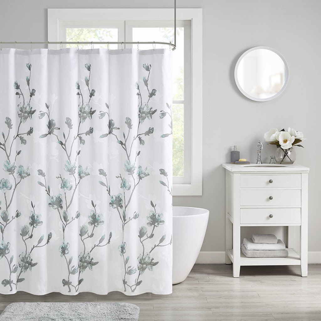 DescriptionAdd a soft touch of beauty to your bathroom with our Madison Park Magnolia Floral Printed Burnout Shower Curtain. This light weight shower curtain features a beautiful floral printed burnout design in soft aqua and grey hues, for a fresh and modern duet. An added microfiber liner provides better privacy and drapability; while still machine washable for easy care. Measuring 72"x72", this floral shower curtain is the perfect addition for a lively, feminine touch.Product Details72x72"1 Shower Curtain:72"W x 72"LMaterial65% Rayon, 35% Polyester