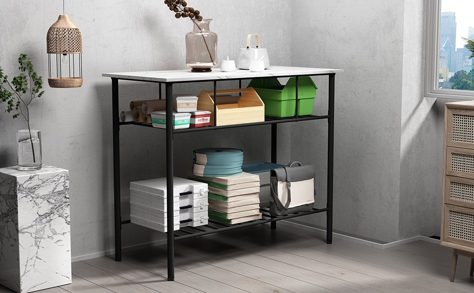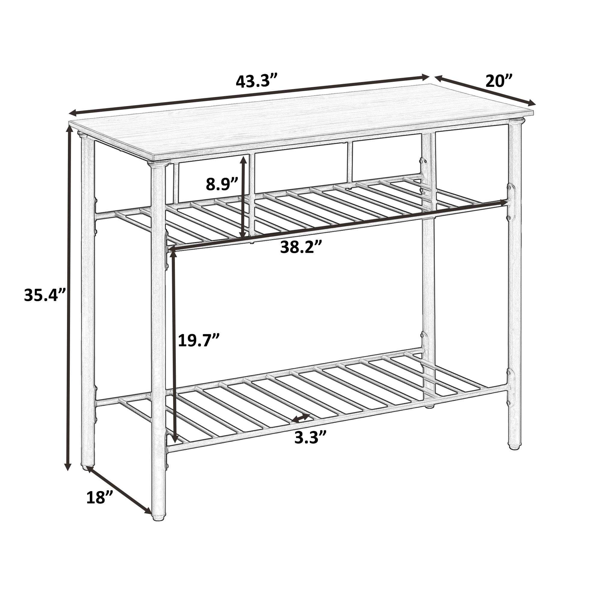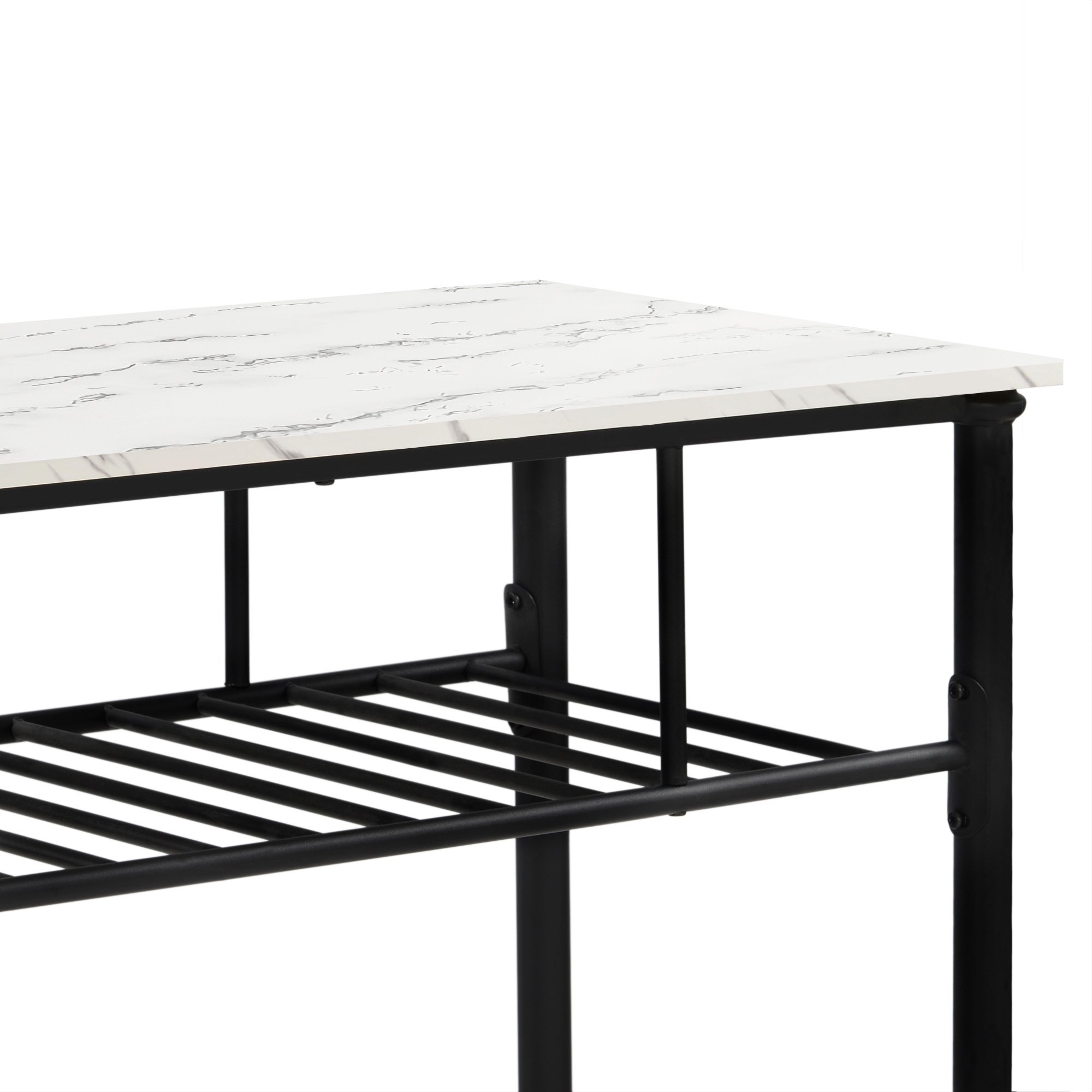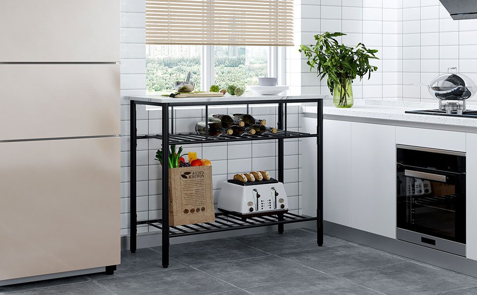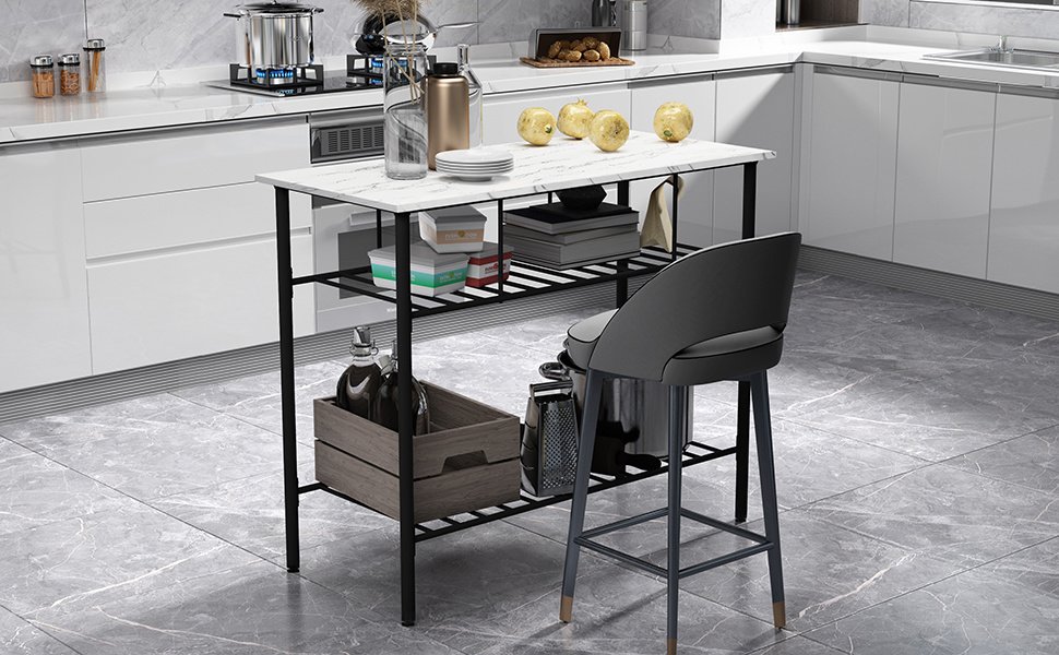 Multifunctional TableDesigned with suitable top and several shelves, this table also perfect for storing your smalls things in living room not only just as a kitchen island. Just put the table against the wall and set your favorite books, snacks and toys etc on the top. Warm Notice: Stools or Chairs are not included.Weight&Dimensions&SpecificationsOverall Product DimensionTable size: 43.3x20x35.4inch(LxWxH); Table Top Thickness: 0.6inchOverall Weight27 lbsWeight CapacityTop: 225lbs Metal Rack:150lbsMaterialTable Top: MDF+PVC Frame: IronPieces Included1* Kitchen Island+ Manual+ HardwareColorFaux White Marble +Black FrameAssembly RequiredYesAdditional Tools RequiredAll Tools IncludedCountry of OriginChinaProduct WarrantyPlease Read Return Policy