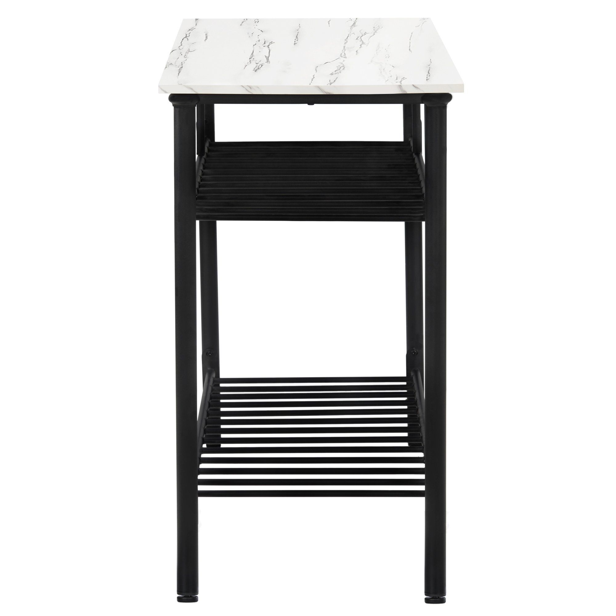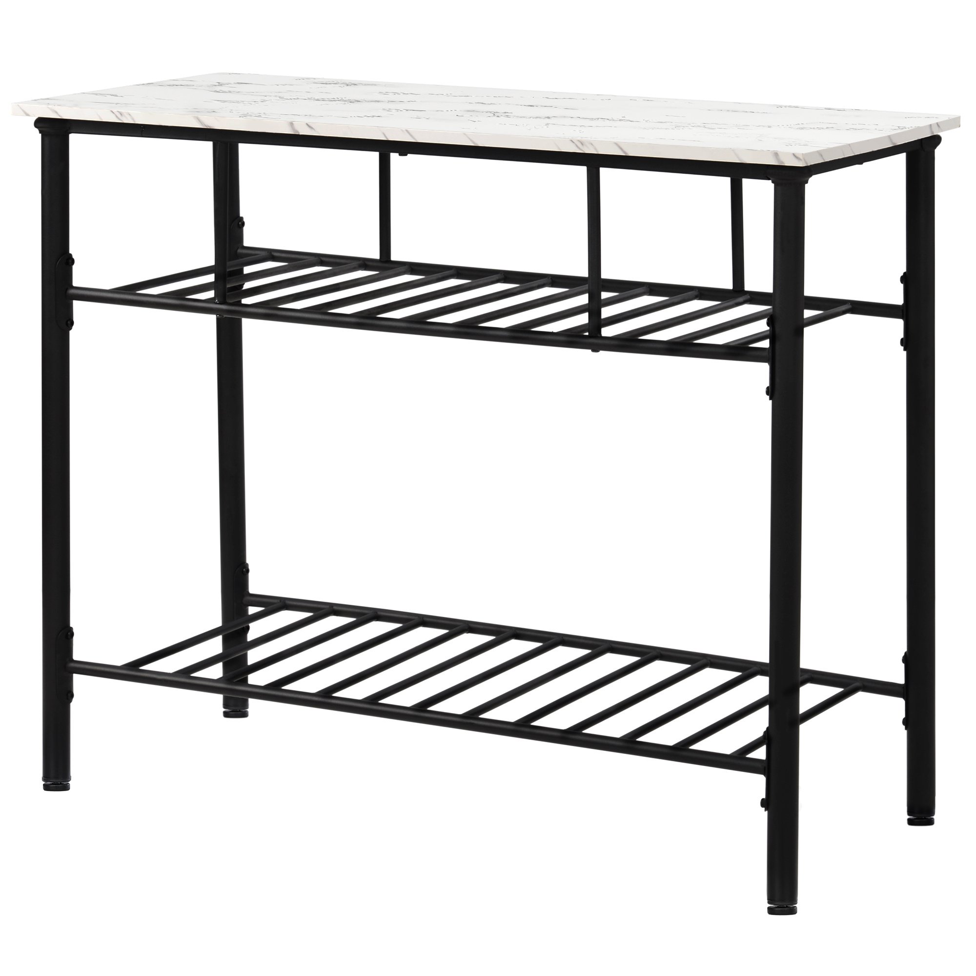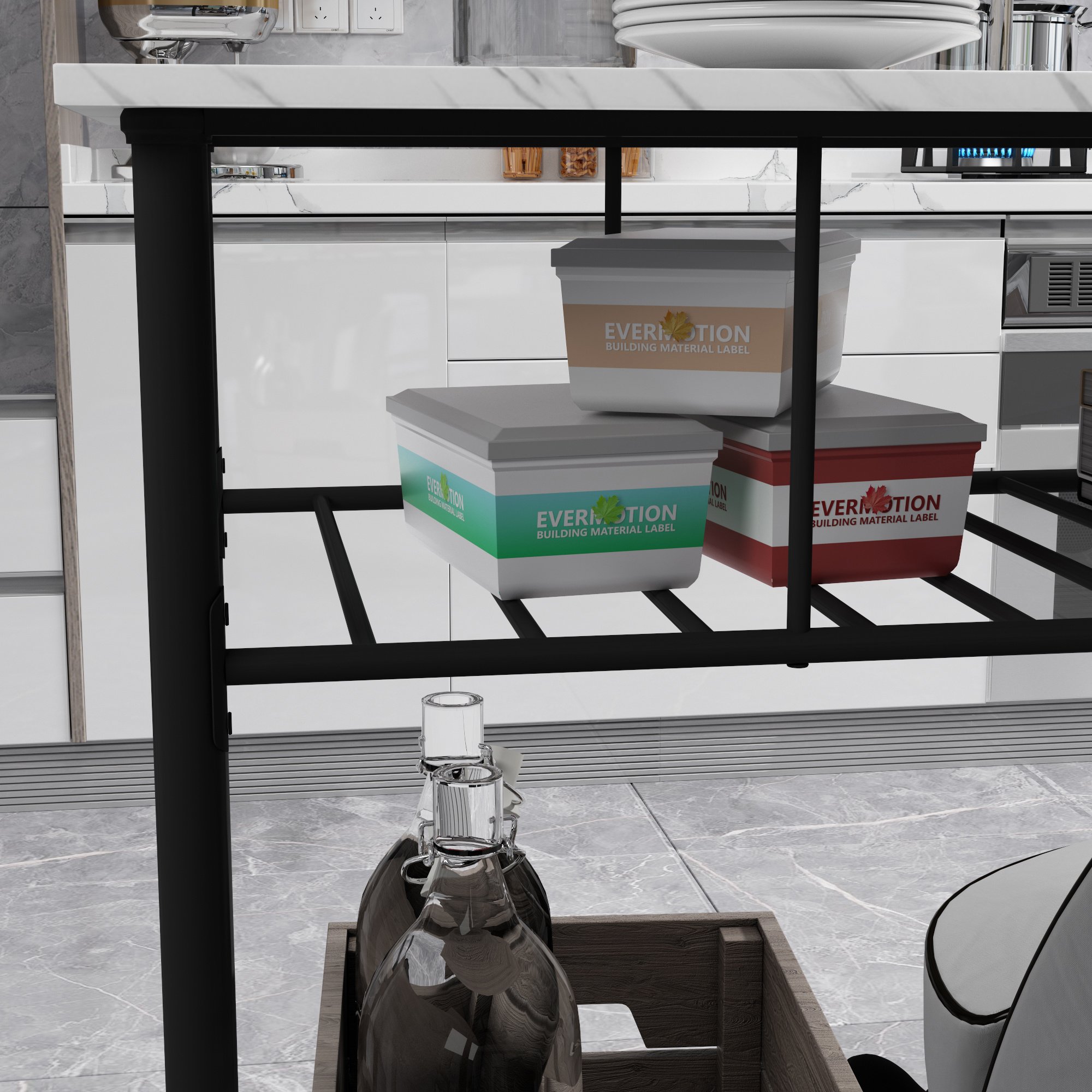 Multifunctional TableDesigned with suitable top and several shelves, this table also perfect for storing your smalls things in living room not only just as a kitchen island. Just put the table against the wall and set your favorite books, snacks and toys etc on the top. Warm Notice: Stools or Chairs are not included.Weight&Dimensions&SpecificationsOverall Product DimensionTable size: 43.3x20x35.4inch(LxWxH); Table Top Thickness: 0.6inchOverall Weight27 lbsWeight CapacityTop: 225lbs Metal Rack:150lbsMaterialTable Top: MDF+PVC Frame: IronPieces Included1* Kitchen Island+ Manual+ HardwareColorFaux White Marble +Black FrameAssembly RequiredYesAdditional Tools RequiredAll Tools IncludedCountry of OriginChinaProduct WarrantyPlease Read Return Policy