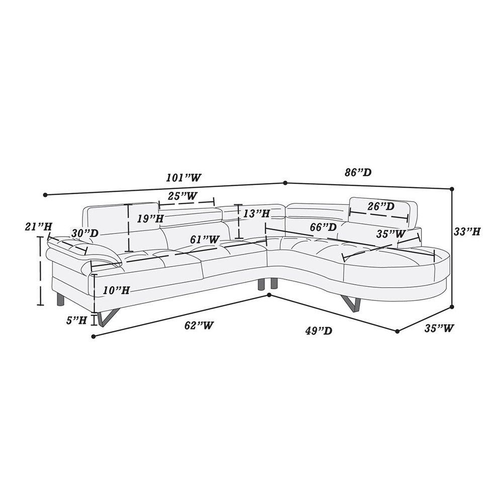 Product DescriptionThe living room sofa set has the elegance of contemporary fashion. The sofa is a two-piece sectional featuring a unit upholstered in a light grey faux leather with a wide seating area and a two-paneled back cushion with adjustable headrests.