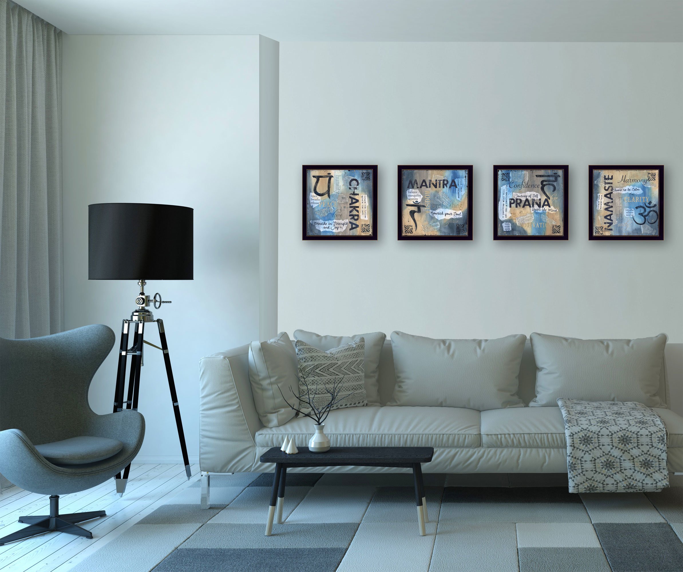 Yoga Collection, "Yoga Series-Chakra, Prana, Mantra, Namaste" is 4- 14"x14" framed art prints in a decorative black frame of the art of Debbie DeWitt. The print has a protective, archival finish (glass is not needed) and arrives ready to hang. Made in the USA with pride by skilled American workers.•Women Owned (WBE)•Textured Artwork with a 'rolled on' acid free acrylic coating to create a canvas painting effect. No glass is necessary.•UV protectant coating protects artwork from fading.•Arrives Ready to Hang