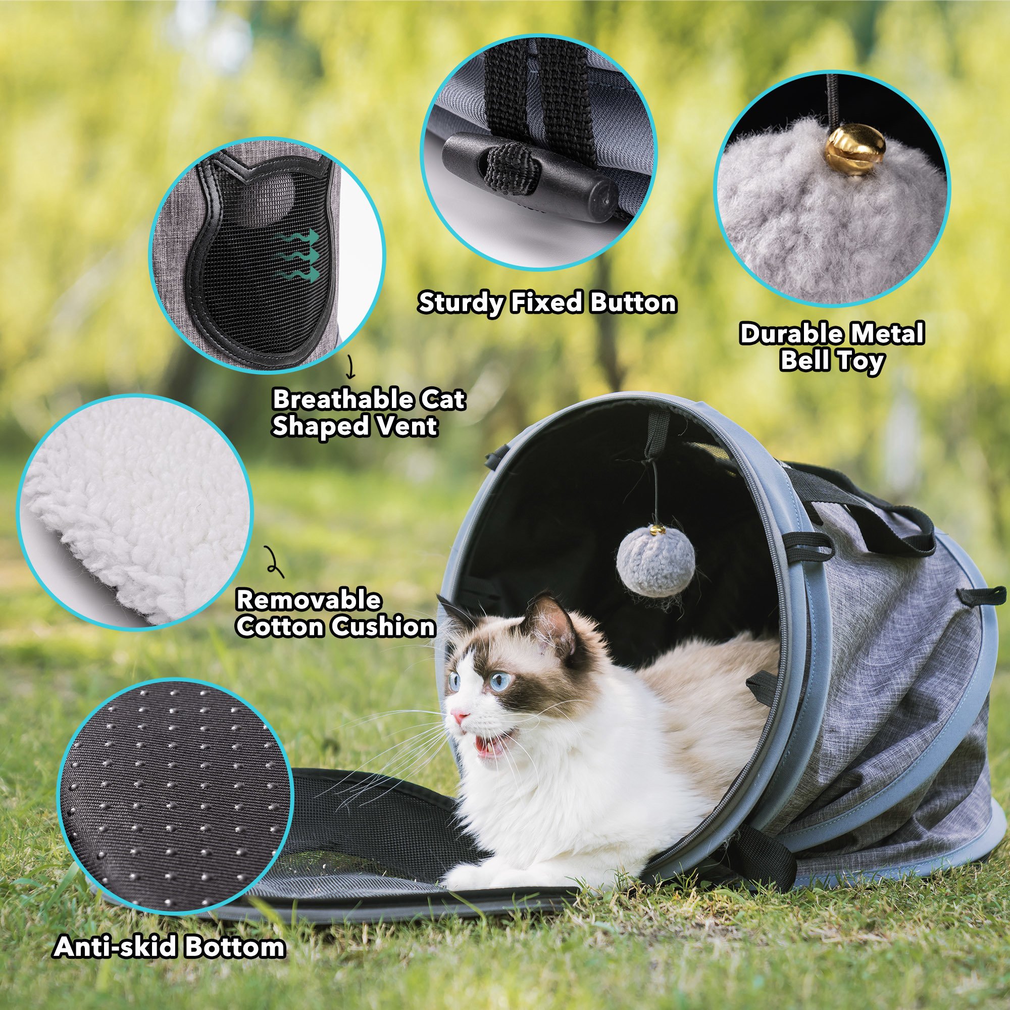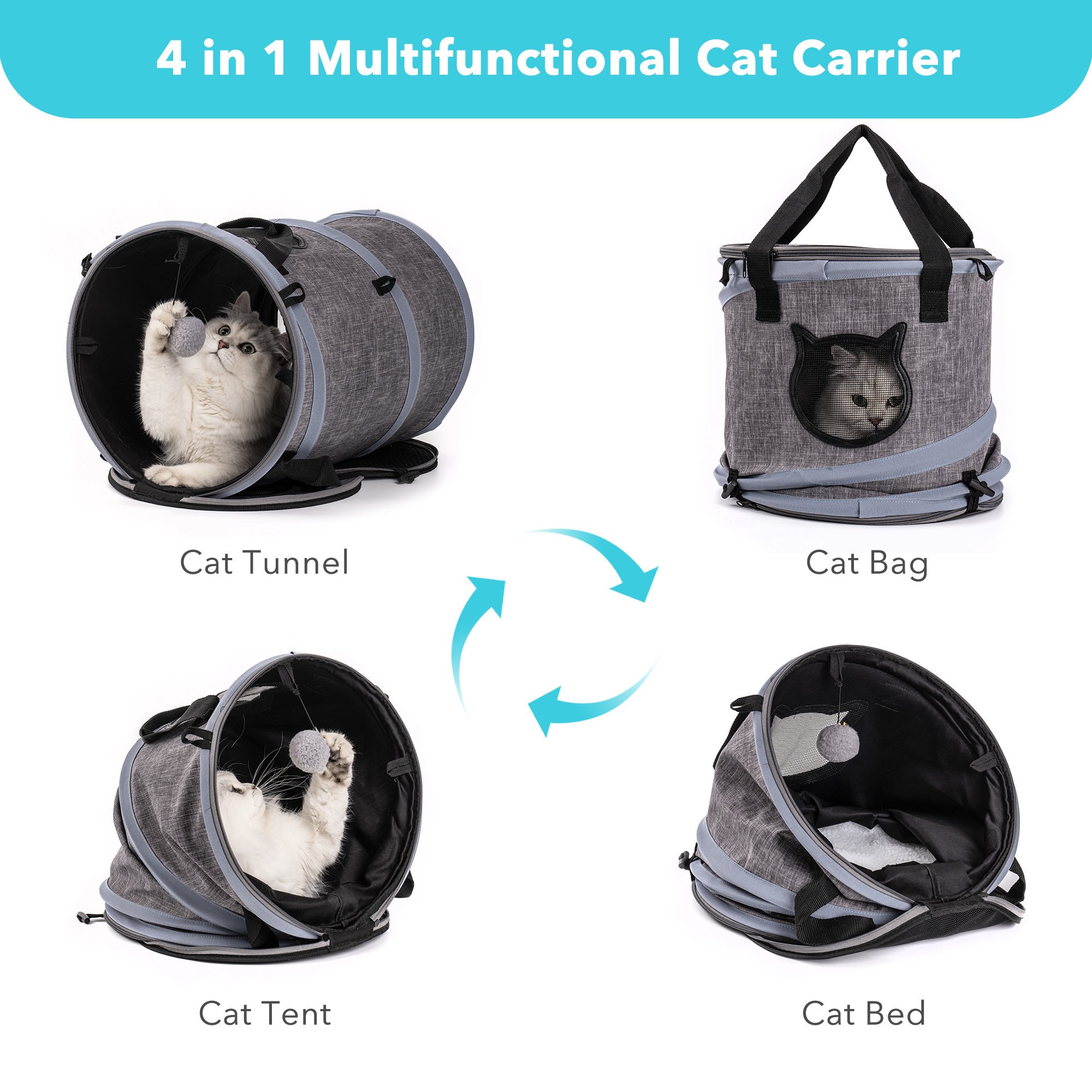 3-in-1 Design:This cat bed is a perfect combination of tunnel + bed + carrier; with a built-in plush ball toy; You can use it as a pet carrier on your travels; at home for your pet to play; hide; hunt or a relaxation.