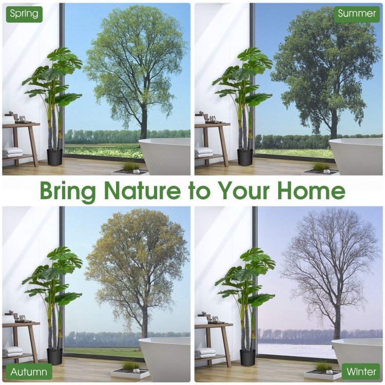 This 4 ft artificial tree mimics a real monstera deliciosa plant, implementing tropical-inspired fun into your home decor, which is also perfect as a housewarming gift. 20 large textured leaves and realistic moss give the tree a more realistic and fuller appearance. Besides, the leaves are made of premium PEVA material and the trunks are made of premium PE material, making it more durable for a long-term use. And the plastic pot is filled with sturdy cement, preventing children or pets from knocking it down. More than that, in contrast to the real tree, this artificial plant is not affected by seasons, hard to fade, and resistant to sunlight and water, keeping evergreen. And it is easy to assemble by inserting 20 leaves one by one and flare out leaves for a more natural look.