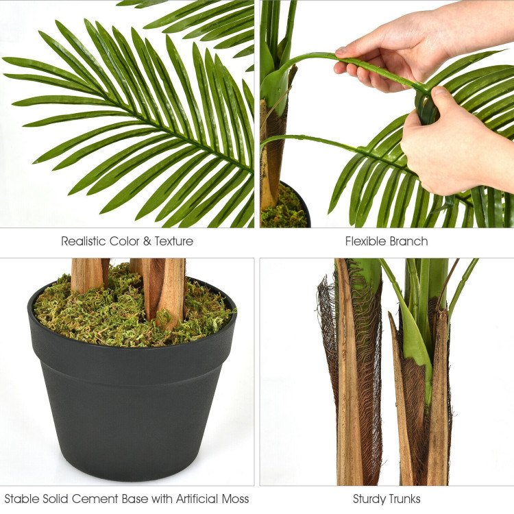 Unmissable gift for opening party or housewarming partyRealistic appearance is an excellent decoration for home, office, store and hotelsFlexible branches allow you to bend or adjust the position as neededThe wooden tree trunk and cement base ensure the stabilityArtificial moss on the flowerpot adds to the authenticityNon-toxic and odorless materials won't cause harmNo watering and maintenance requirement maintains the height, color and shapes for yearsThe lightweight phoenix palm tree is easy to transportNo installation requirement for saving timeYou just need a wet cloth or rag to wipe off the dust