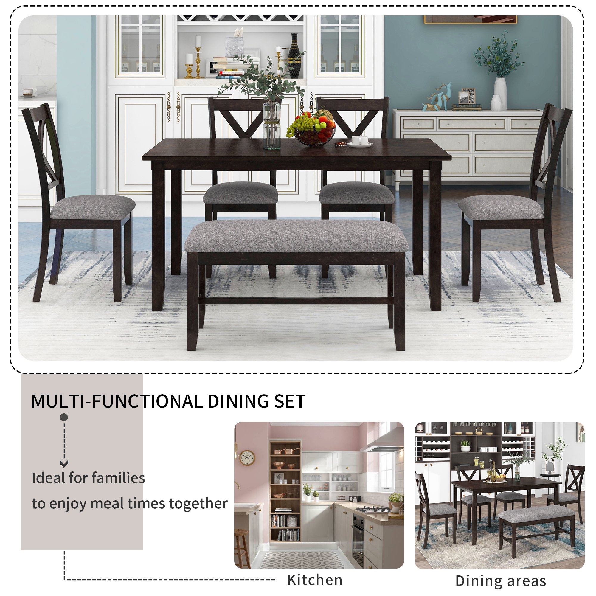 Home > TREXM 6-Piece Kitchen Dining Table Set Wooden Rectangular Dining Table, 4 Fabric Chairs and Bench Family Furniture (Espresso)