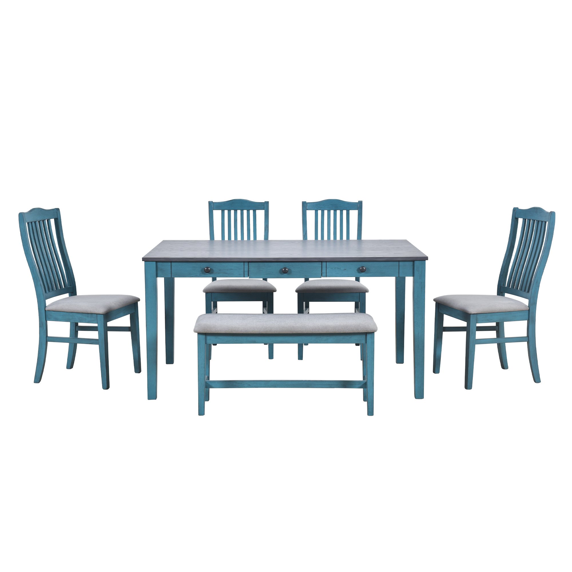 Home > TOPMAX Mid-Century 6-Piece Wood Dining Table Set, Kitchen Table Set with Drawer, Upholstered Chairs and Bench, Antique Blue