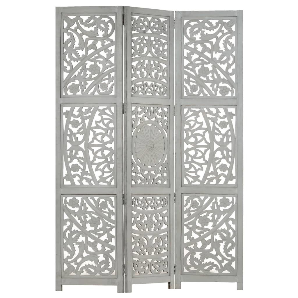 Hand carved 3-Panel Room Divider Gray 47.2"x65" Solid Mango Wood