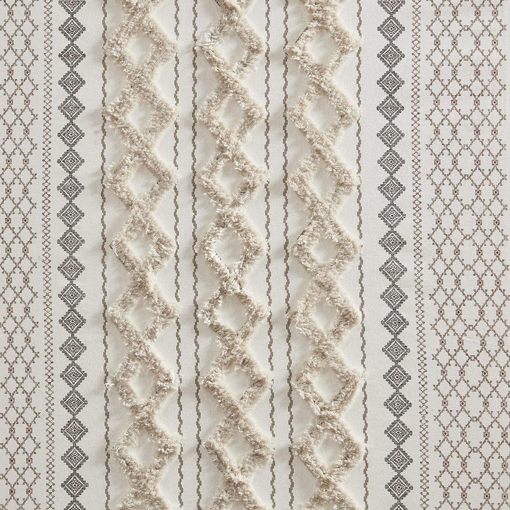 DescriptionThe INK+IVY Imani Cotton Printed Window Panel with Chenille Stripe and Lining offers a chic and casual update to your home. This ivory window panel features a geometric print with a tufted chenille stripe trim, for a textured artisanal look and feel. A lightweight white cotton lining on the reverse softly filters light, while providing better drapability and added privacy. In addtition, this 100% cotton curtain panel is also OEKO-TEX certified, meaning it does not contain any harmful substances or chemicals for the best in quality comfort and wellness. Each panel is finished with a rod pocket top for easy hanging, and back tabs for a more clean and tailored finish. This window panel is sold as a single and 2 window panels must be purchased to cover any standard size window. Complete the look with coordinating bedding sets and bath decor, available and sold separately.Product Details50x84"1 Window Panel:50"W x 84"LMaterial100% cotton, printed and tufted with chenille, with cotton lining on the back. Finished with rod pockets and back tabs; fits up to 1.25 inches diameter rod.