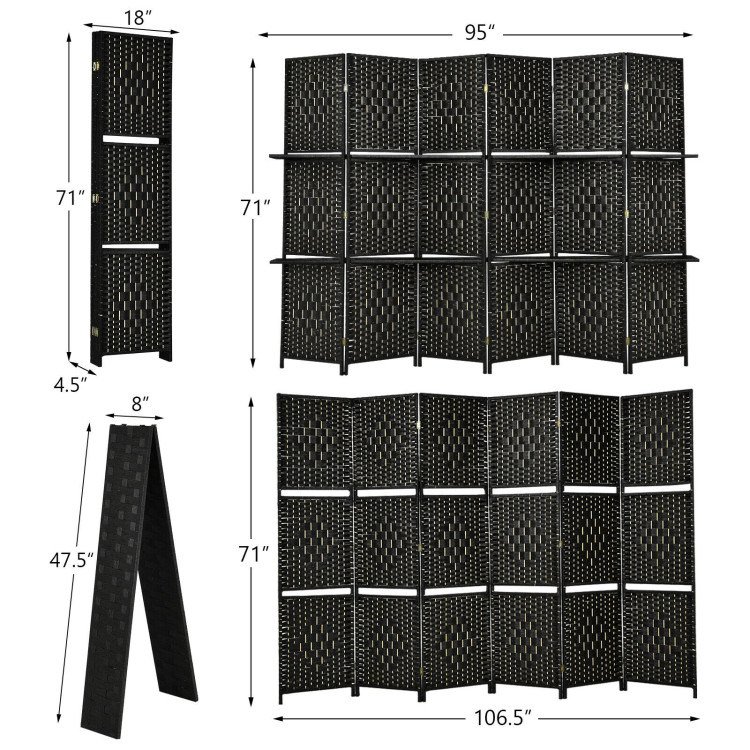 This 6 panel room divider will bring your home natural and elegant sense and can match any styles. With the two shelves equipped; it allows you to place exquisite decors and beautify your room. You can easily separate your room and get your personal space. The hand-woven fiber pattern can take your room to the next level while also features great durability for long-term use. When not in use; you can fold it into a compact size for easy storage and saving space. Definitely; it will be a necessary addition to your home.